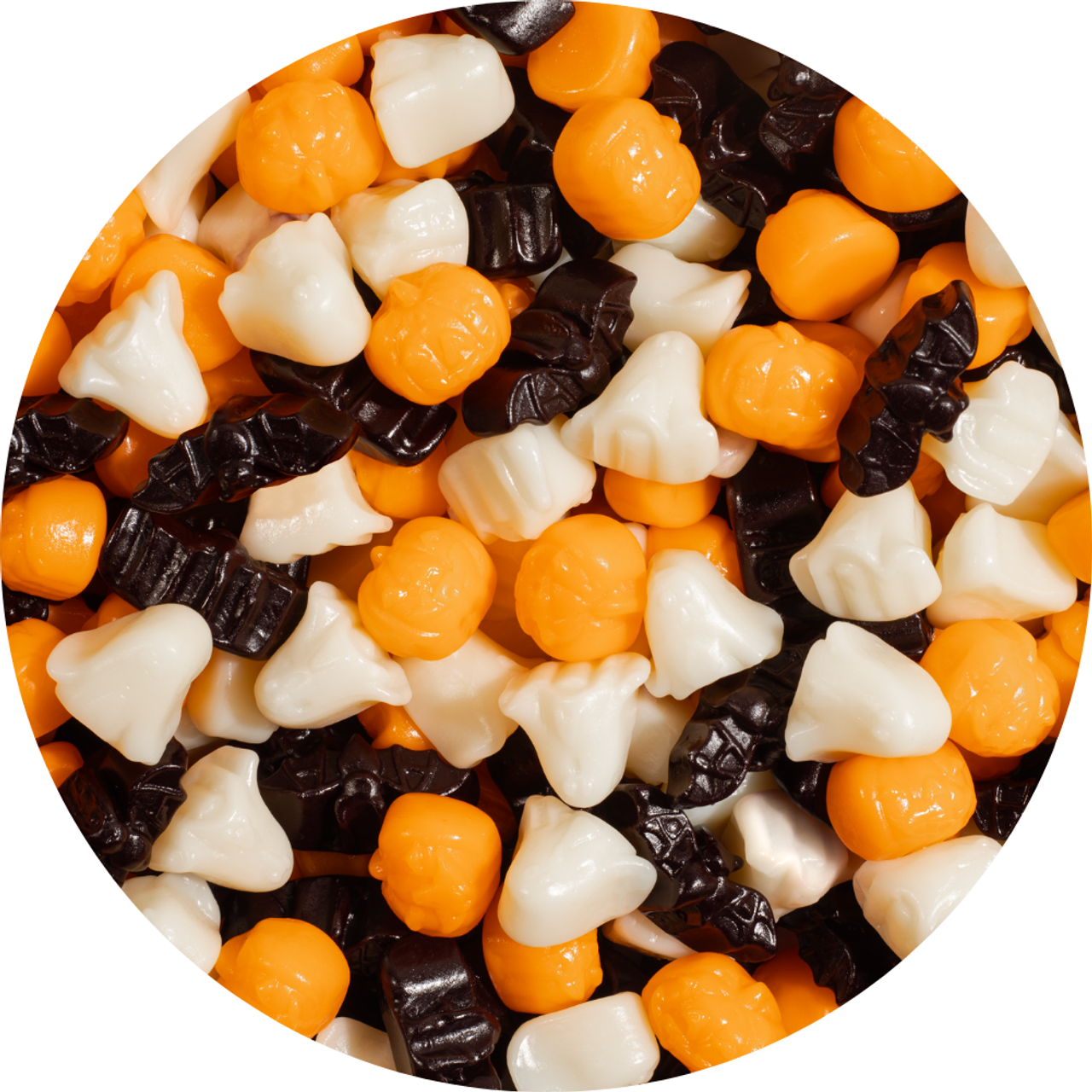 A 0.75 pound mix of ghost, bat, and pumpkin shaped gummies in the flavors of strawberry banana, black cherry, and orange.